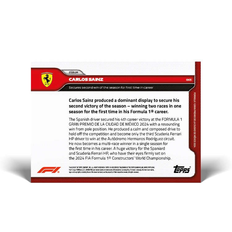 Carlos Sainz – Secures second win of the season for first time in career – 2024 Formula 1® Topps NOW® Card 65 – PR: 1740