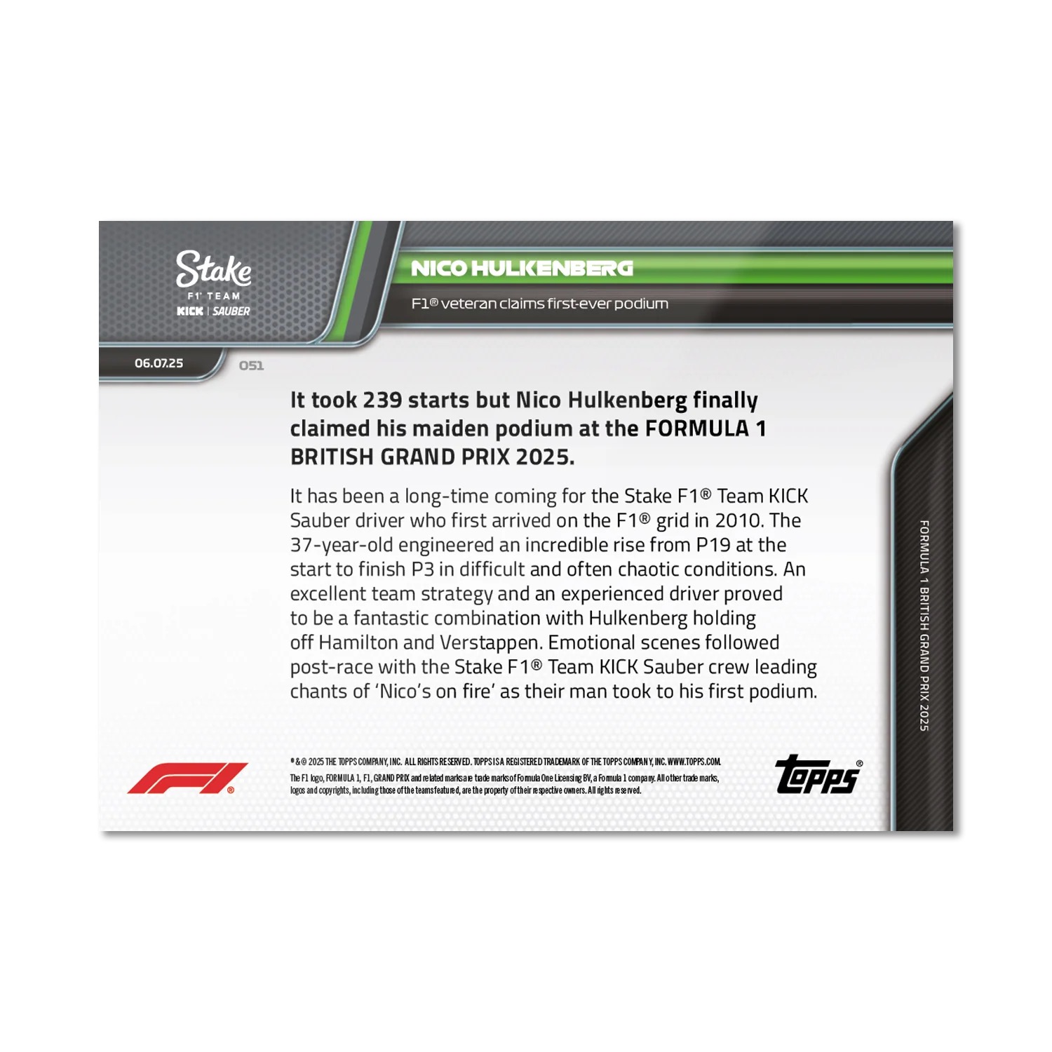 Nico Hulkenberg – 2025 Formula 1® Topps NOW® – Card 51 – PR: 4055