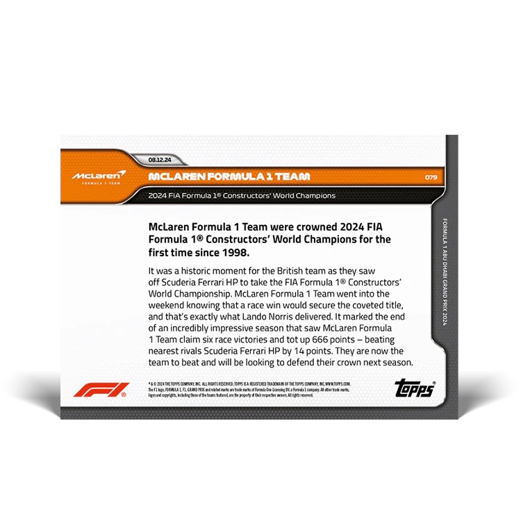 McLaren F1® Team – FIA Formula 1® Constructors’ World Champions 2024 – 2024 Formula 1® Topps NOW® Card 79 – PR: 2519